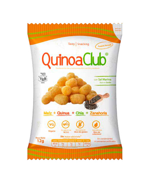 Harina de maíz, harina de quinua, aceite vegetal no hidrogenado, sal marina, colorante natural achiote, fécula de maíz, semillas de chía, zanahoria en polvo, especias naturales deshidratadas [ajo, cebolla].(Solamente aplica para la referencia Quinua + Chía + Zanahoria)